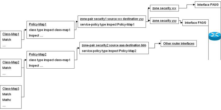 Configuring zone-based policy firewall on a cisco IOS router is not as easy. To be able to understand the topology of the configuration I used some colors. The key hierarchy is the following: