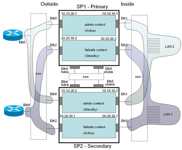| context admin allocate-interface Ethernet0 allocate-interface Ethernet1 config-url flash:/admin.cfg join-failover-group 1 context failsafe allocate-interface Ethernet2 ethernet0 allocate-interface Ethernet3 ethernet1 config-url flash:/failsafe.cfg join-failover-group 2 |