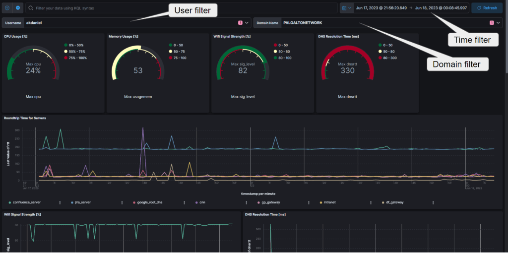 If all done the dashboard has been built (thats pretty simple in Kibana or in Grafana) this is one possible result that can be used for supporting client cases, bad experiences.