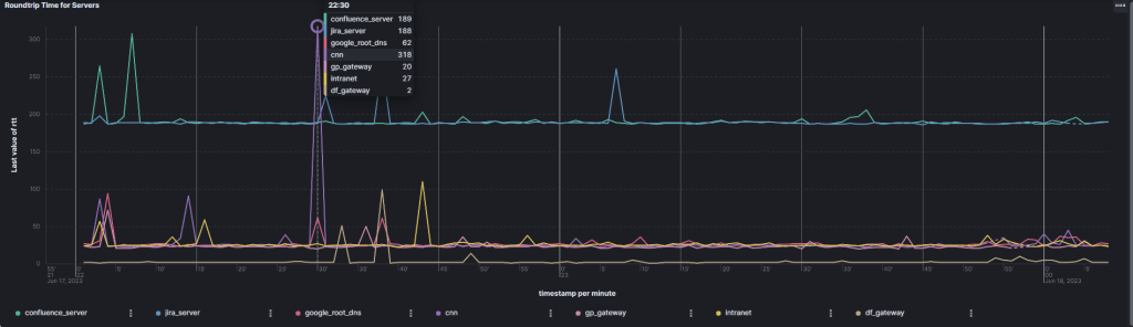 Here are the RTT values represented in Kibana. You can see that the internal servers are way slower in response time then an internet server like the webserver from cnn.com (remember all those hosts are customizable, and some of them are dynamic, like the vpn gateway IP and the default gateway of the vpn client. They should not be set, since the script collects them dynamically):