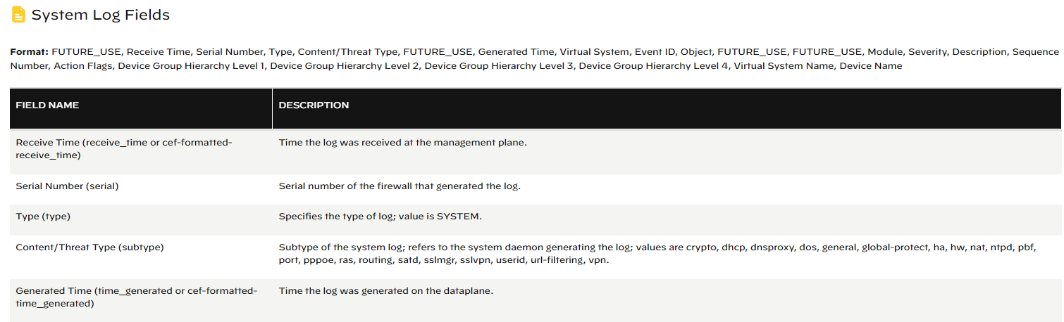 At a Cisco Firepower for example there are more classes but the associated ID lists and the unstructured field values makes it difficult to parse it. Here we have to do it for each syslog message that is very time consuming but possible. The advantage that Cisco has is that they document the syslog event and Palo Alto does not.