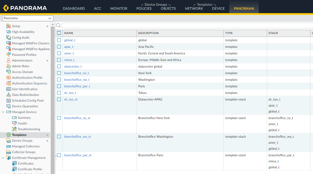 This is just 11 device-groups and 13 templates in stasks, this is just for demostration purposes, I could have created more I know :-)
