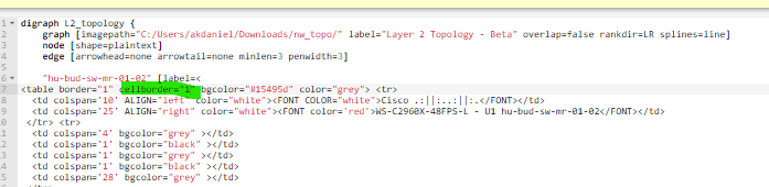 Good this is all about switches and their uplinks. Next I wanted to test how far I can go with model desinger, so I decided to create another modell from another vendor and I have choosen the PA-3260 Firewall to design from html table. :-P Here is the result, see original and the Beta I have created. I believe its realistic enough to use it for NOC in monitoring, the good stuff is that it is an svg object after the rendering you are not loosing any resolution if you see the rendered objects on smartphone or on a very large display in the NOC. Since its an html table, you can easily set the colors of the cells, like below the port1, port23 and the mgmt port is green meaning those port are up and the port19 is red, meaning the port is down. (okay some data on the right bottom corner is still missing in my node, but that was just to demostrate the possibilities of graphviz, it was not designed fully for using it in production enviroment. (Let me know if you need it, I will be more then happy to finalize it, so it can be a one-to-one match compared with the real PA-3260 hardware front panel.)