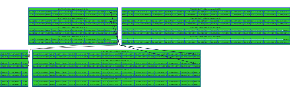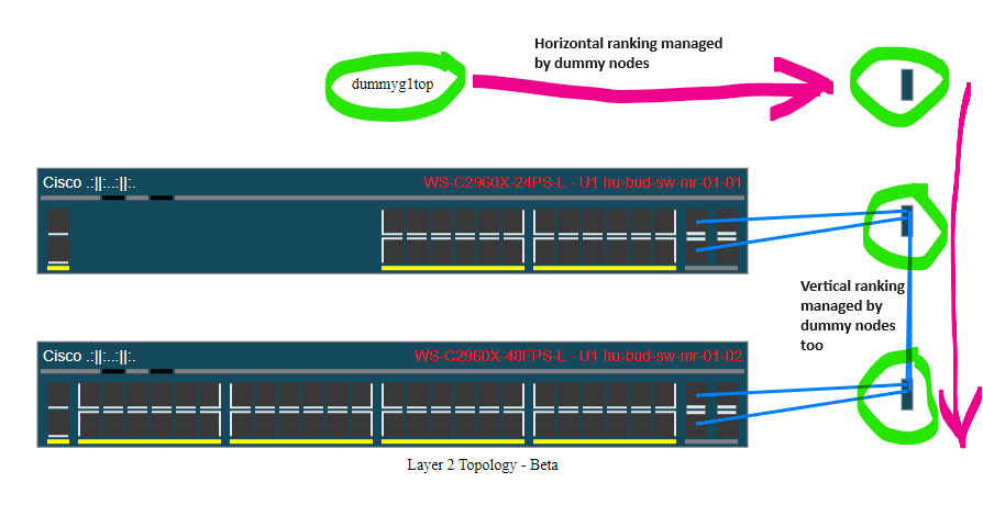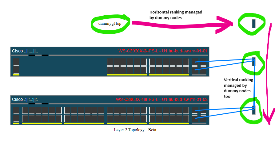 you can see that the leading of the edge (that is the cable) is managed by dummy nodes that are not presented. For the ranking of the nodes there is a horizontal and a vertical ranking with the dummy nodes. The nodes for the switches have a ranking too but it is only to define who is on the top of the rack and in which order they are in the rack. For the whole design for the cabling in graphviz I had to suffer a lot till I come to the level you see on the below screenshot, but I can tell at least I have now the knowledge to share it with anyone or to create whatever layer 2 topology I have to: