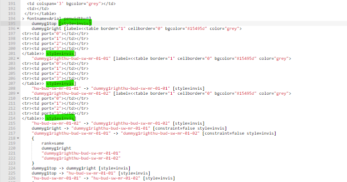 To visualize the structured cabling for switches in rack and and keep it for clear documentation I had to create the so called dummy nodes in graphviz. If you open the cabling_switches.txt file from github and paste the output to the visual editor and change the following for the dummy nodes: