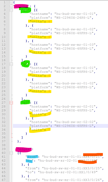 For the edges we set the source switch and destination switch and the ports that connects the switches (blue and orange marked) the from and the to keys in json.